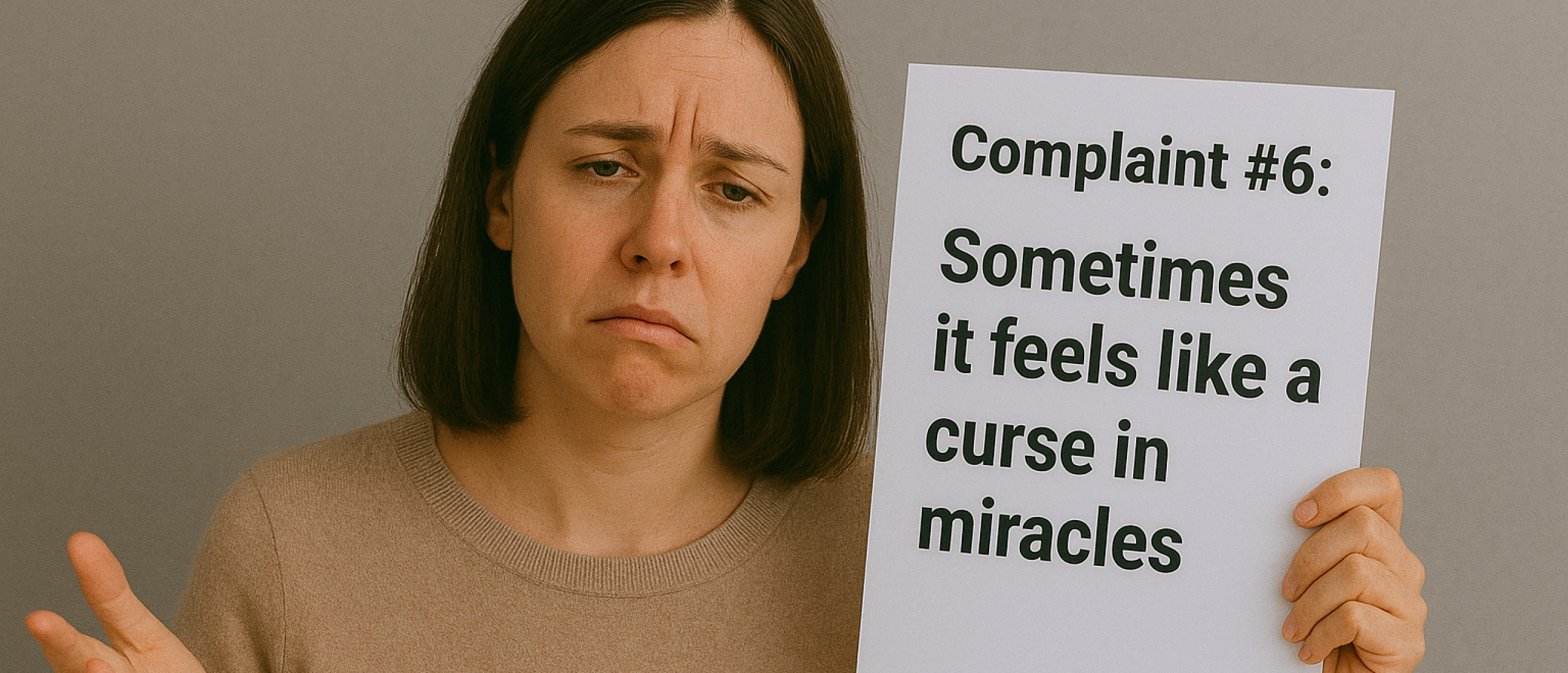 Een Cursus in Wonderen is niet gemakkelijk. Het lijkt te spreken in een vreemde taal die een tolk nodig heeft, de boodschappen staan vaak haaks op veel van onze overtuigingen en het vraagt ons voortdurend bewust te zijn van de impact van onze gedachten. Zelfs wanneer het materiaal resoneert met wat we weten dat waar is, kan er van tijd tot tijd weerstand tegen de leringen van de Cursus opkomen, wat een sterke reden kan lijken om ermee te stoppen. Het volgende is een verzameling van veelgehoorde klachten die we zelf hebben ervaren of van anderen hebben gehoord. Het is bedoeld om je te laten weten dat als je frustratie hebt ervaren met de Cursus – je niet alleen bent!